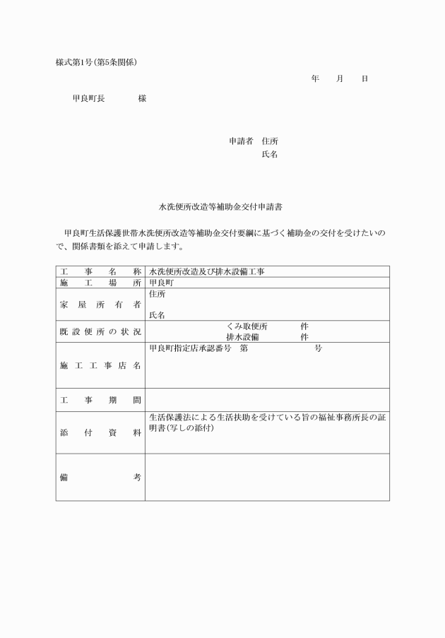 第5条 補助金の交付を受けようとする者は、甲良町下水道条例(平成8年条例第21号)第5条の規定による排水設備新設等計画確認申請書及び排水設備工事調書を提出と同時に水洗便所改造等補助金交付申請書(様式第1号)を町長に提出しなければならない。