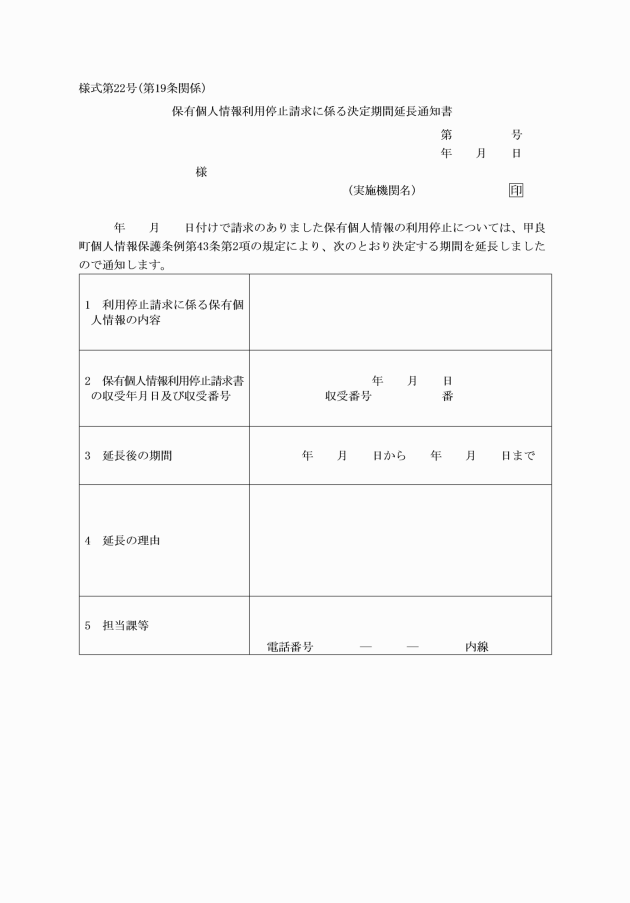 第19条 条例第43条第2項の規定による通知は、保有個人情報利用停止請求に係る決定期間延長通知書(様式第22号)により行うものとする。