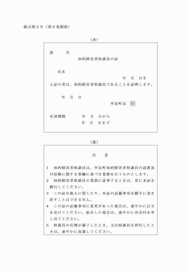 第9条 町長は、相談員に業務を委嘱したときは、相談員であることを証明する証票(以下「相談員の証」という。)(様式第3号)を発行するものとする。