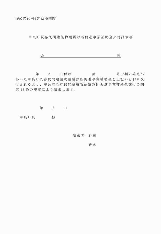 第10条 補助決定者は、事情により耐震診断を中止しようとするときは、速やかに甲良町既存民間建築物耐震診断促進事業補助金交付中止届(様式第7号)を町長に提出しなければならない。
