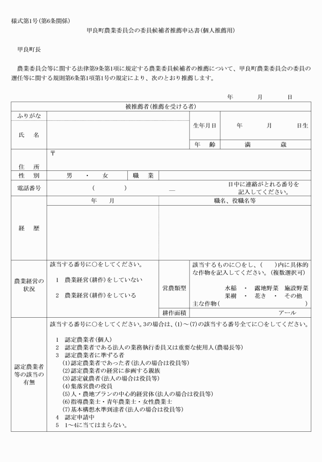 第1条 この規則は、甲良町農業委員会の委員(以下「農業委員」という。)の候補者の推薦及び募集(以下「募集等」という。)並びに選任の手続等について、農業委員会等に関する法律(昭和26年法律第88号。以下「法」という。)に規定するもののほか、必要な事項を定めるものとする。