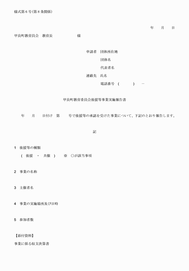 第8条 教育委員会の後援等の承認を受けた事業の主催者は、当該事業が終了したときは、速やかに甲良町教育委員会後援等事業実施報告書(様式第6号)に事業収支決算書を添付して、教育長に提出しなければならない。